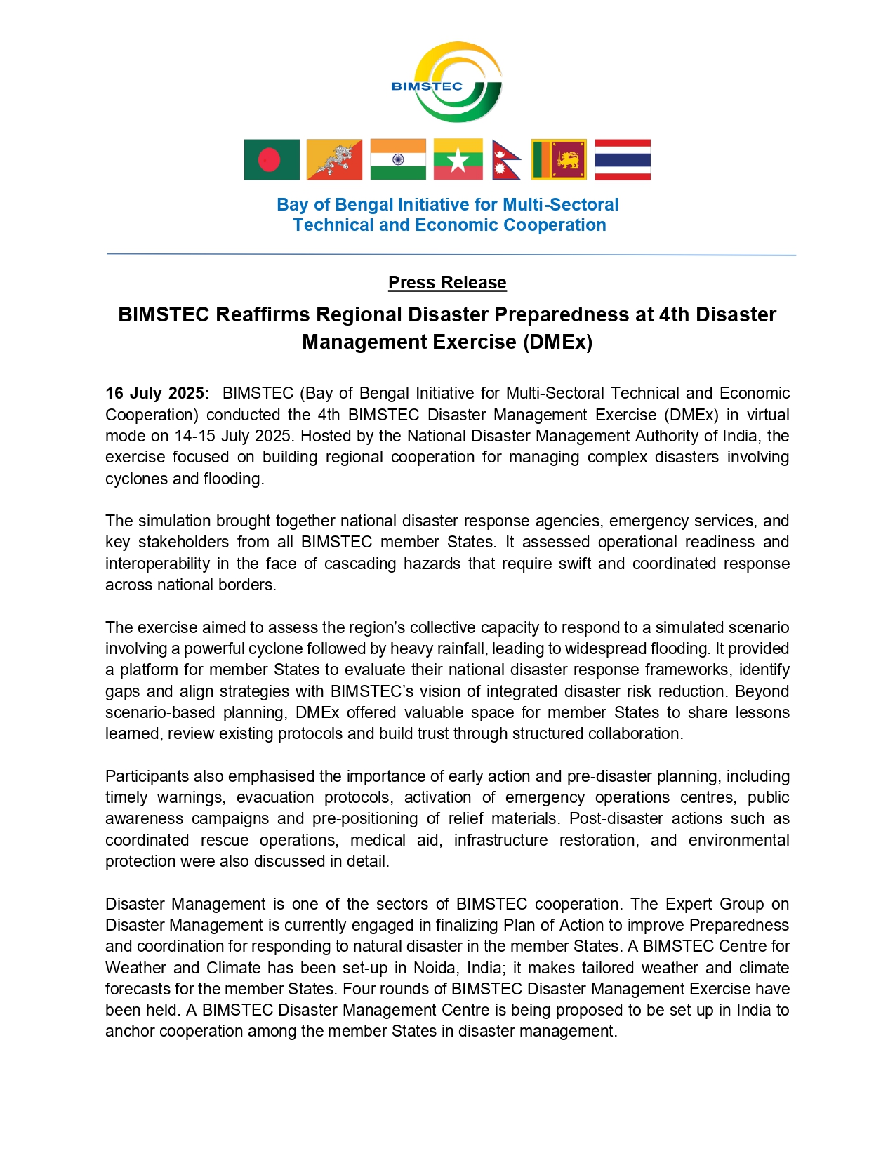 BIMSTEC Press Release: 4th Disaster Management Exercise (DMEx) -2025